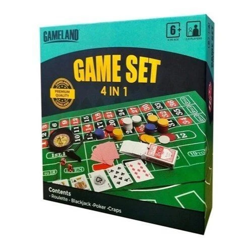A stunning 4-in-1 game set, with four casino games. Roulette, Blackjack, Poker and Craps. Has 2 double-sided felt mats, cards, scoring chips. By Gameland.