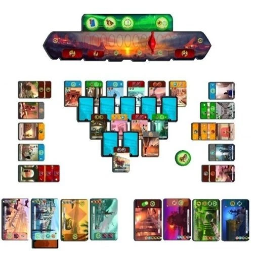 Players can purchase resources at any time from the bank, or they can gain cards during the game that provide them with resources for future building; as you acquire resources, the cost for those particular resources increases for your opponent, representing your dominance in this area. A player can win 7 Wonders: Duel in one of three ways. Each time that you acquire a military card, you advance the military marker toward your opponent’s capital, giving you a bonus at certain positions. If you reach the opponent’s capital, you win the game immediately. Similarly, if you acquire all six different scientific symbols, you achieve scientific dominance and win immediately. If neither of these situations occurs, then the player with the most points at the end of the game wins.  Â