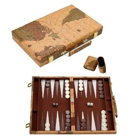 Old World Map design on an elegant large size backgammon set with felt-lined imitation suede interior.