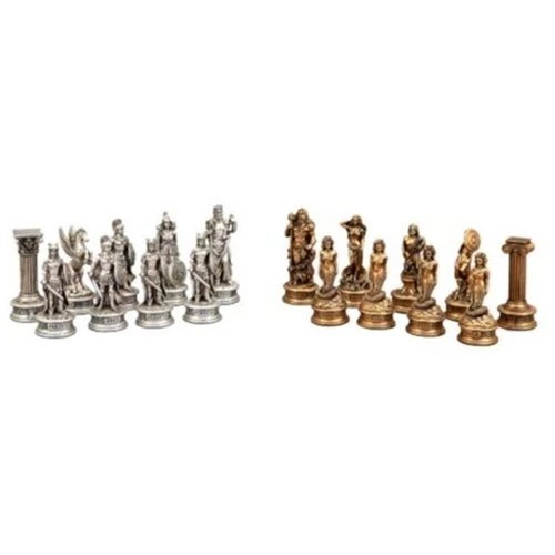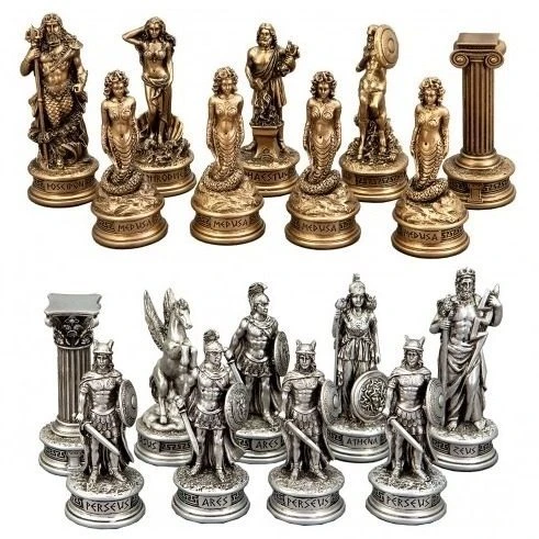 Lets the Gods battle in this beautifully crafted set of resin Greek Mythology chess pieces. All pieces have a symbol denoting their matching traditional chess piece for additional clarity!