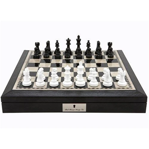 This amazing set features Black & White Boxwood Double Weighted Wooden Chess Pieces in the French Lardy Staunton style on a hand-made Black & White chess board on a leather Bevel Edged storage box.  A perfect edition to any study or games room, and a great gift idea for the serious or not so serious chess player.