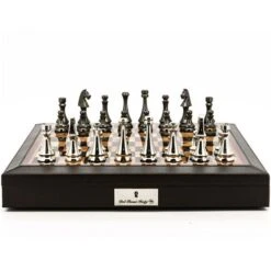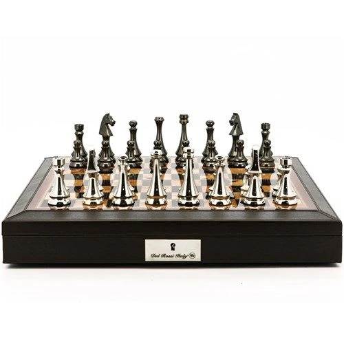 This amazing set features Dark Titanium & Silver finish chess pieces on a hand-made wooden walnut gloss finish chess board with leather Bevel Edged storage box. A perfect edition to any study or display area, and a great gift idea for the chess players of distinction. Dal Rossi luxury chess sets are a statement of extravagance, coveted world over for their elegance and flawless construction.