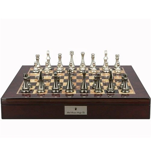 Dal Rossi luxury chess sets are a statement of extravagance coveted world over their elegance and flawless construction. This amazing set features Dark Titanium & Silver finish chess pieces on a Mahogany Gloss Finish board with compartments and lock.  A perfect edition to any study or games room, and a great gift idea for the serious chess player.