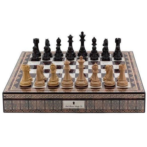 Dal Rossi luxury chess sets are a statement of extravagance coveted world over their elegance and flawless construction. This ebeautiful set features Ebony and Box Wood Finish chess pieces on a Mosaic board with compartments and lock.  A perfect edition to any study or games room, and a great gift idea for the serious or casual chess player.