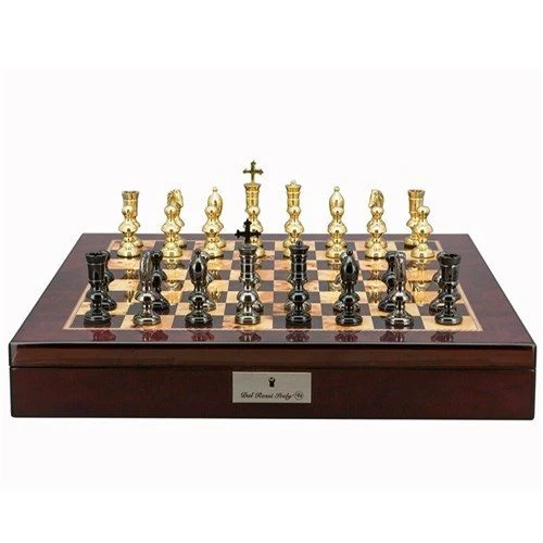 This magnificant chess set features weighted Metal Dark Titanium & Gold finish chess pieces on a beautiful Mahogany Gloss Finish board with compartments and lock.  A statement of elegance and a perfect edition to any study or games room, and a great gift idea for a chess player.Â