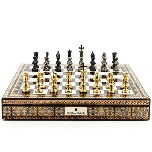 This magnificant chess set features weighted Metal Dark Titanium & Gold finish chess pieces on a Mosaic board with compartments and lock.  A perfect edition to any study or games room, and a great gift idea for the serious or casual chess player.