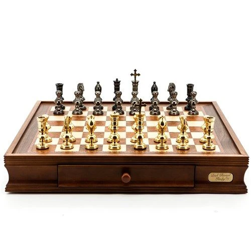 This magnificant chess set features weighted Metal Dark Titanium & Gold finish chess pieces on a handmade wooden walnut finish chessbox with drawers. A perfect edition to any study or games room, and a great gift idea for the serious chess player.Â