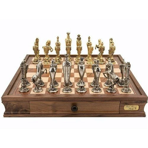 Dal Rossi luxury chess sets are a statement of extravagance, coveted world over for their elegance and flawless construction. This amazing set features trully magnificient gold and silver metallic heavily-weighted Renaissance style chess pieces on a handmade wooden walnut finish chessbox with drawer. A perfect edition to any study or display area, and a great gift idea for the chess players of distinction.
