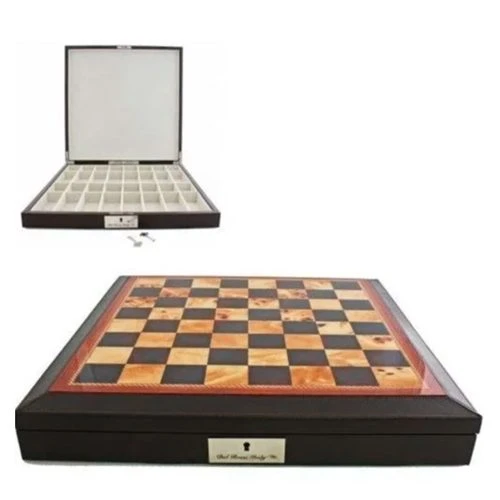 The chess board opens via the hinged lid to access 32 compartments (16 large & 16 small) to conveniently provide storage for the pieces when not in use. The board can be locked.