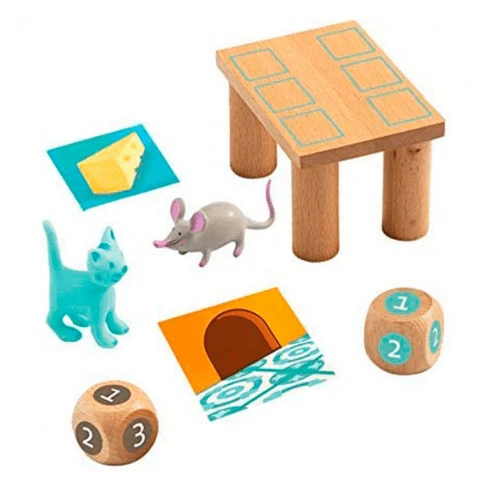A semi -cooperative strategy game for mice players: One player plays the cat, the others, the mice. Alternately, one mouse plays, and then the cat. The mice need to collect ten pieces of cheese, whilst the cat tries to catch the four mice. On your turn, roll the dice, move forward the corresponding number of squares, and turn over the tile of the square you land on. Then carry out the action indicated on the tile (cheese, broken plate, +1, +2, a Super Move, etc.). If a mouse turns up a piece of cheese, it can keep it. If the cat lands right on the square where a mouse is sitting, it catches it