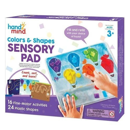 Parents fill the Colours & Shapes Sensory Pad with their choice of liquid (water, gel, shaving cream, glycerin, etc.). Then, children use their fingers to guide the shapes through 1 of the activities shown on the 8 double-sided Activity Cards. The focus is on hand-eye coordination, tactile development, visual stimulation, strengthening fine motor skills, and sensory exploration.