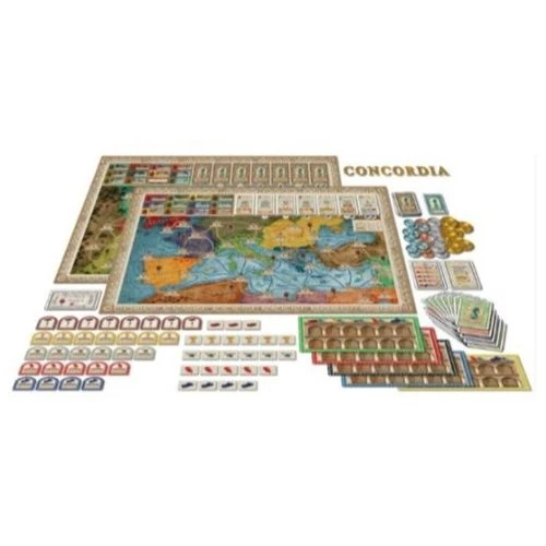 Concordia is a strategy game that requires advance planning and consideration of your opponent’s moves. Every game is different, not only because of the sequence of new cards on sale but also due to the modular layout of cities. (One side of the game board shows the entire Roman Empire with 30 cities, while the other shows Roman Italy with 25 cities for 2-4 players.) When all cards have been sold or after the first player builds his 15th house, the game ends. The player with the most VPs from the gods (Jupiter, Saturnus, Mercurius, Minerva, Vesta, etc.) wins the gameÂ