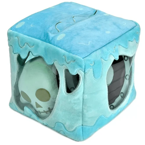 Upon first glance, this soft friend may look like an inert cube of jelly, but its face has a hungry determination. That being said, it will make a great friend as long as you keep it fed—maybe throw it an adventurer or two as a snack every once in a while! If you look closely, some bits and bobs are already floating around inside this adorable cube of jelly; don’t mind the glow-in-the-dark bones and various belongings of adventurers long gone! This interactive plush stands at 8 inches and has an opening on the back panel to allow you to remove or add items as you see fit. Included inside this plush on purchase are a few equally adorable plush accessories: a skull, 3 bones, a sword, and a shield! This cute gelatinous cube companion is made from the softest premium materials and lots of love.