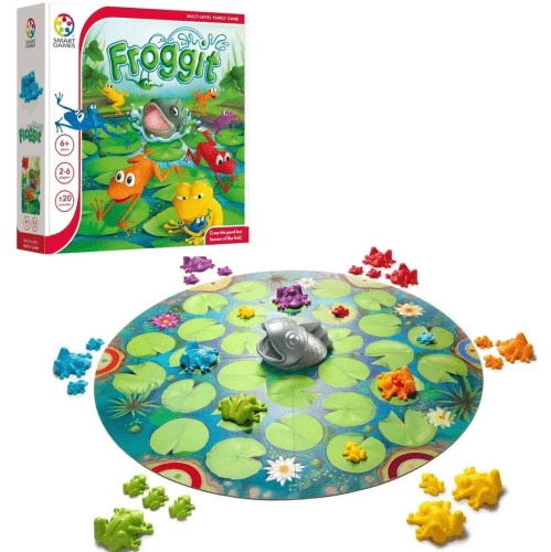 Guide your frogs across the pond and block other players from doing the same. The first player to get their entire frog family to the other side wins the game. But watch out, the fish can scare your frogs back to the start! Flexible thinking, clever planning and the chance to thwart your opponents make this a fun and exciting game for the whole family.