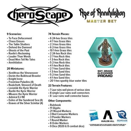The Heroscape: Age of Annihilation Master Set contains a generous amount of content to support hours of epic 2-player minature gaming sessions. Players will be able to draft their armies and play through scenarios that take place during the Battle of All Time. The Heroscape: Age of Annihilation Master Set is for both newcomers and players of yesteryear. It is also compatible with previous and upcoming Heroscape content.