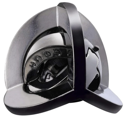 This sphere-shaped cast metal brainteaser puzzle represents a planet and its surrounding ring. Positioned snugly inside the ring, the planet looks as if it cannot be removed. It may appear that all you can do is rotate it on its axis, but is that really the case? By Oskar van Deventer.