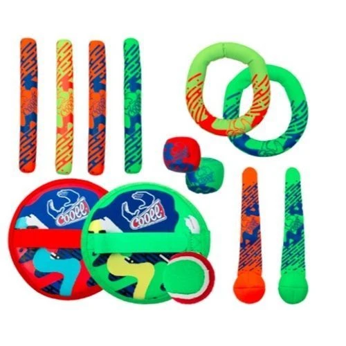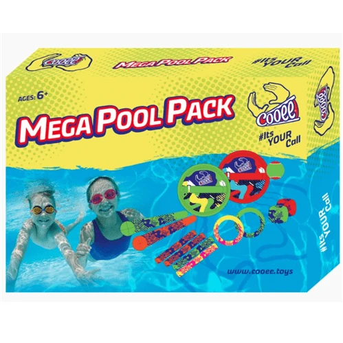 This 11 piece pack includes a pool catch set (2 waterproof grip pads and 1 ball), 2 splat balls, 2 dive streamers, 4 dive stix, and 2 dive rings!