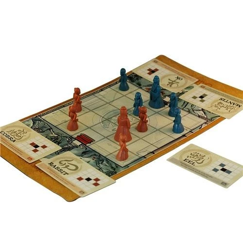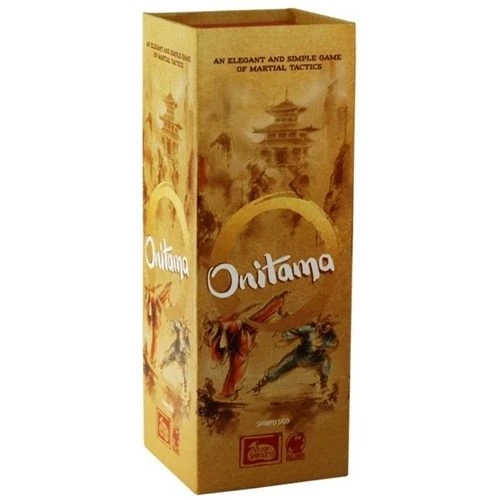 Onitama is a two-player, perfect information abstract game with a random starting set-up. On a 5×5 chess style board, both players start with five pawns on their side, with the main pawn in the middle. Each player has two open cards that each display a possible move for any of his pieces. There is a fifth card that cannot be used by either player. On a player’s turn, he chooses one of his cards, moves one of his pieces according to the chosen card, then replaces the card he used with the fifth card. The other player then chooses one of his cards, moves accordingly, and exchanges that card with this fifth card — which is, of course, the card the first player just used. Moving onto one of the opponent’s pawns removes that pawn from the game. Taking the opponent’s main pawn, or moving your main pawn into your opponent’s main pawn’s starting space, wins you the game.