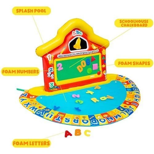 This vibrant splash mat features letters and objects printed around the edges, promoting letter and object recognition. With 39 foam letters, numbers, and shapes that stick to the schoolhouse chalkboard when wet, children can enjoy both play and learning.
