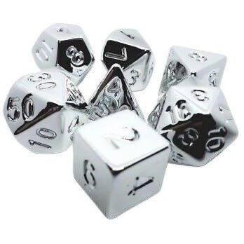 7 shiny silver coloured dice with a little weight and made from plastic