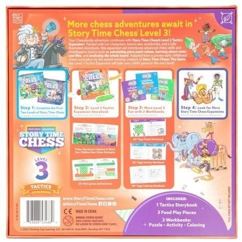 Packed with fun characters, brand-new workbooks, and a fully illustrated storybook, Story Time Chess Lev el 3 Tactics Expansion introduces kids to advance chess skills and middlegame tactics such as calculating piece point values, learning about ranks and files, and analysing the whole board.Â