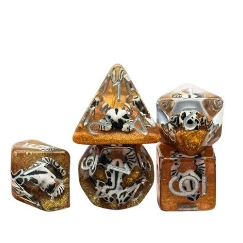 7 translucent resin dice, each containing a bull skull and gold glitter