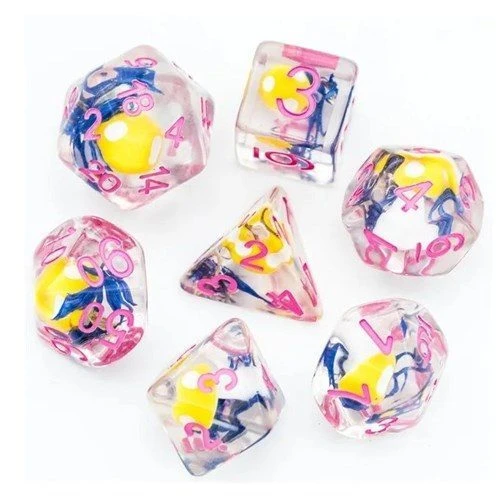 7 translucent resin dice, each containing a yellow mushroom and blue flower with pink numbersÂ